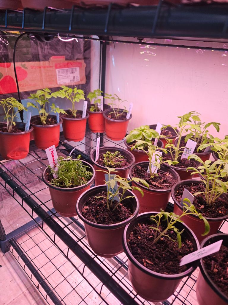 Now, almost every tomato has its own cup. I’ve still got a few left in smaller pots, letting them grow a bit more before I separate them out. But as it stands, I’m at about 60 tomato plants.
